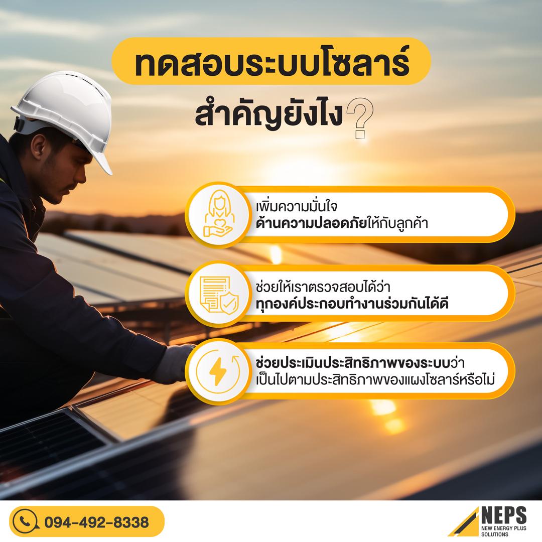 การทดสอบระบบสำคัญไม่น้อยไปกว่าการติดตั้ง โซลาร์เซลล์ เพราะเป็นขั้นตอนที่จะทำให้คุณมั่นใจในประสิทธิภาพของแผงโซลาร์ ป้องกันความเสี่ยงจากอันตราย หรือค่าใช้จ่ายการซ่อมแซมในอนาคต